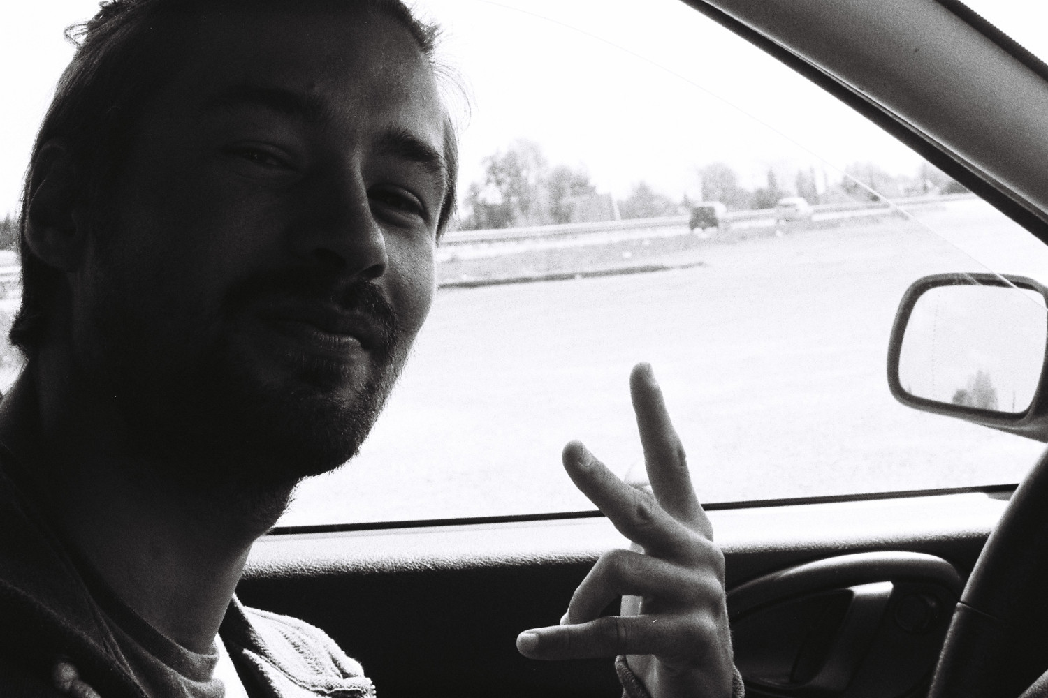 Léo et moi tendons le pouce et rapidement une 405 blanche s'arrête. Nous voici en compagnie d'Axel, queue de cheval, jeune papa, ex-cuisinier,