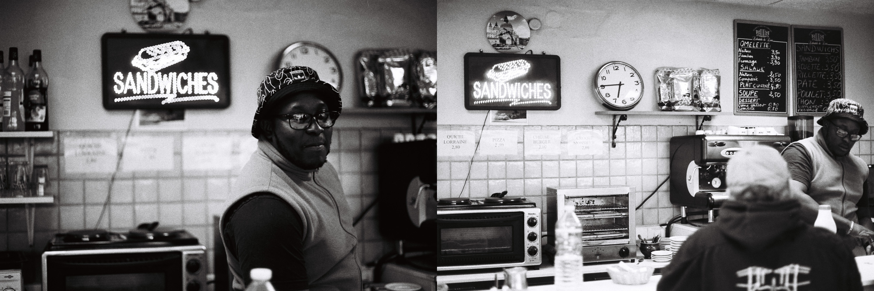 temps de boire quelque chose de chaud. Nous nous installons sur une table, au dos des habitués du comptoir. Quand je me lève pour demander deux cafés, Mouss envoie
